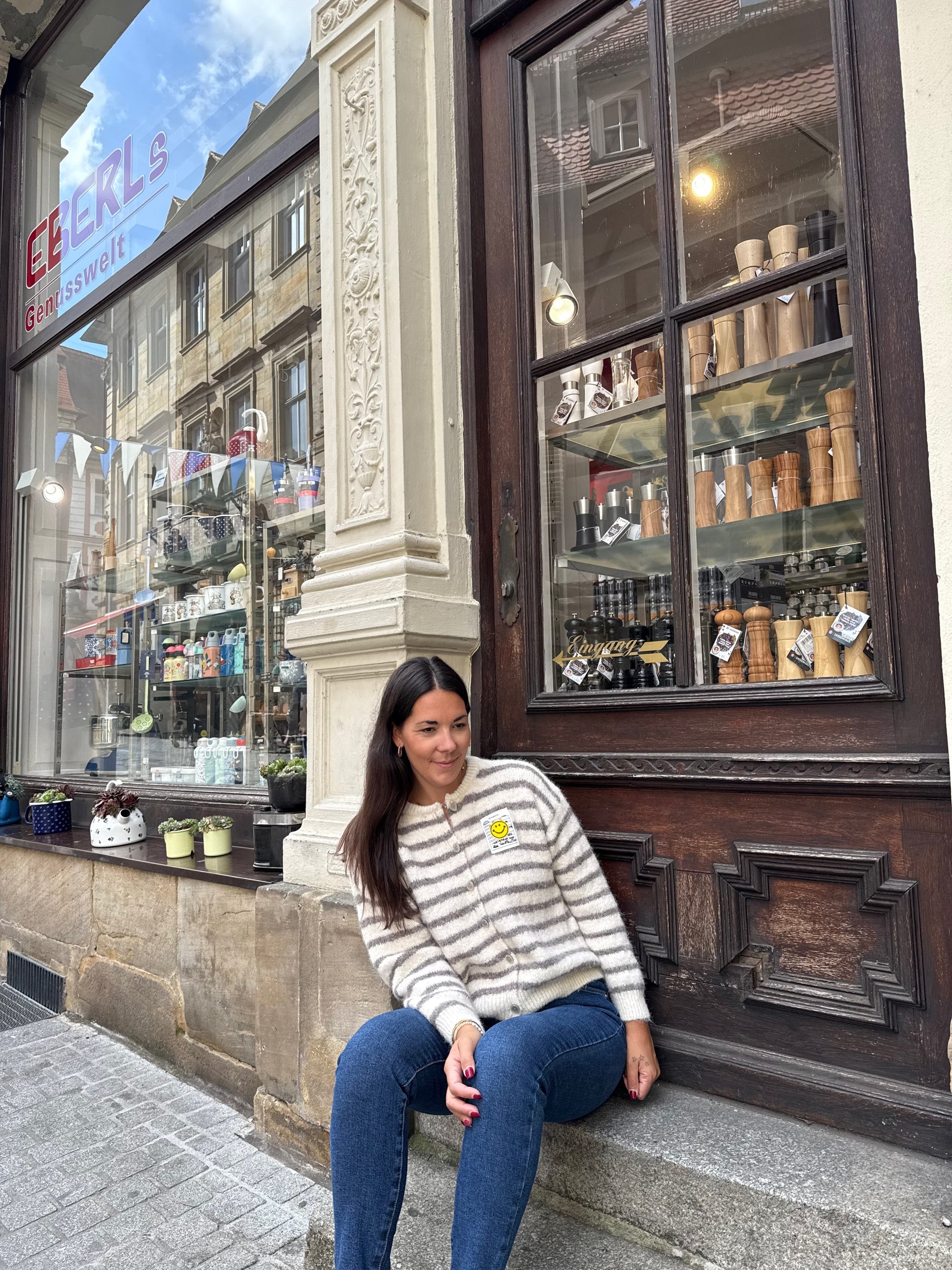 Kuschelige Strickjacke Smiley gestreift in beige