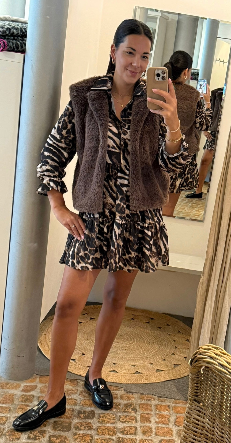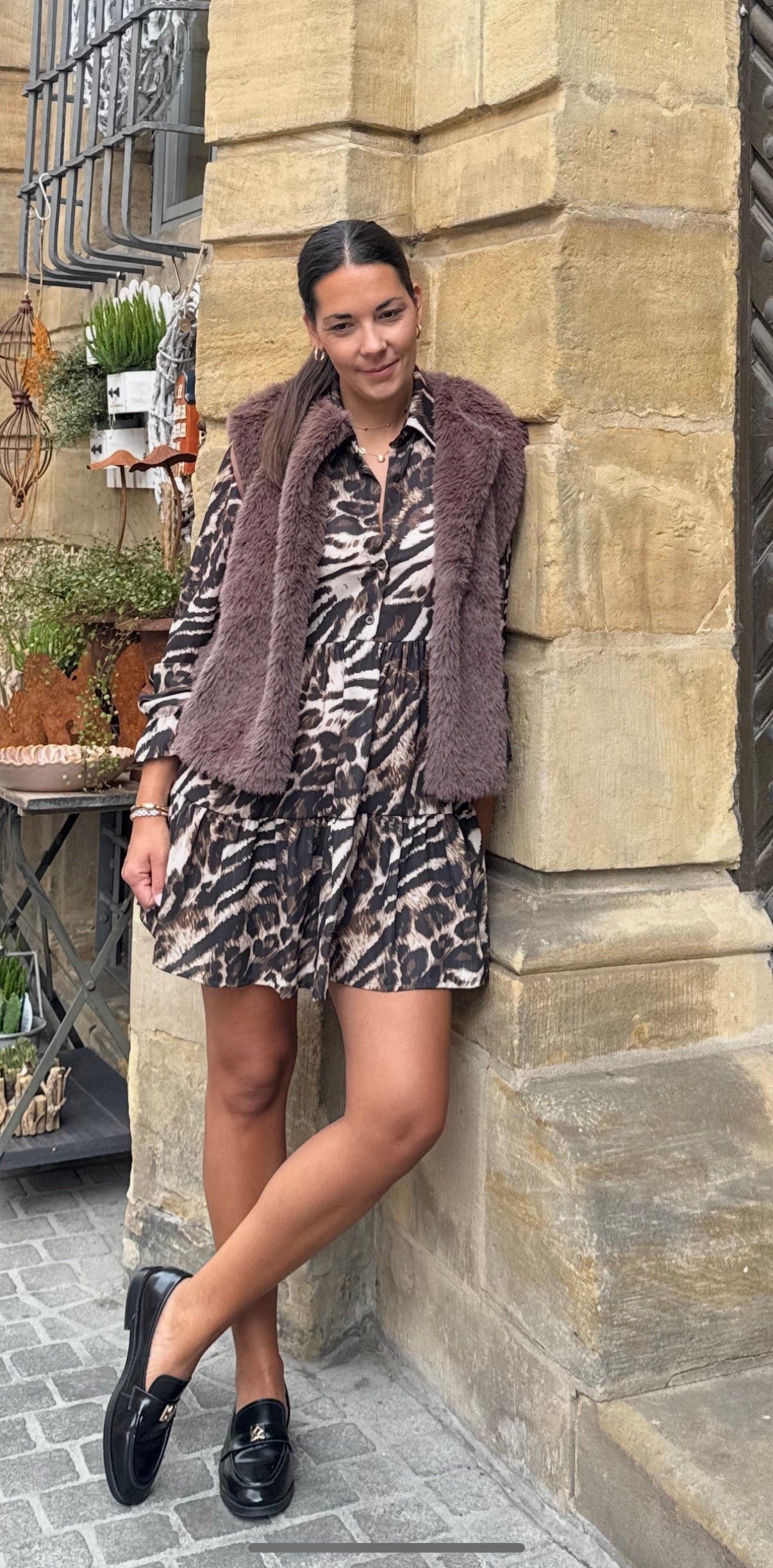 Wunderschönes Kleid mit Saumrüschung, onesize.Vorne mit Knopfleiste und Blusenkragen. Um die Taille ist außerdem eine Gummibund-Raffung. Was das Kleid noch mehr zu einem Hingucker macht sind die dezenten Glitzerfäden die sich über das gesamte Kleid entlang ziehen. Ein definitiver MUST HAVE für deinen Kleiderschrank.