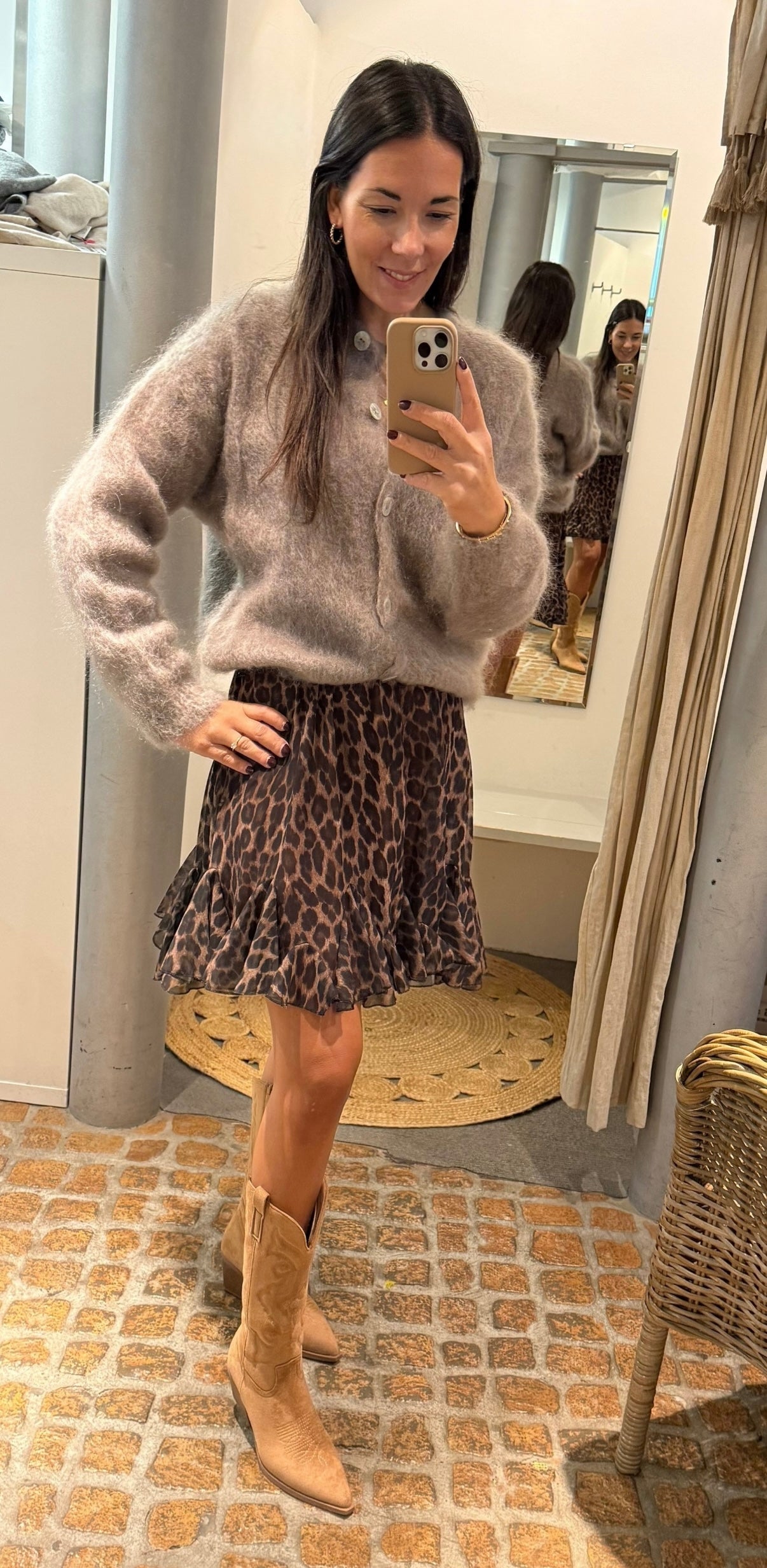 Süßer Rock im Leomuster mit Gummibund. Perfekt kombinieren lässt er sich mit Stiefeln und Loafern. Dazu eine Bluse mit Pullunder oder Pulli, aber auch mit einen Longsleeve oder T-Shirt sieht er gut aus.