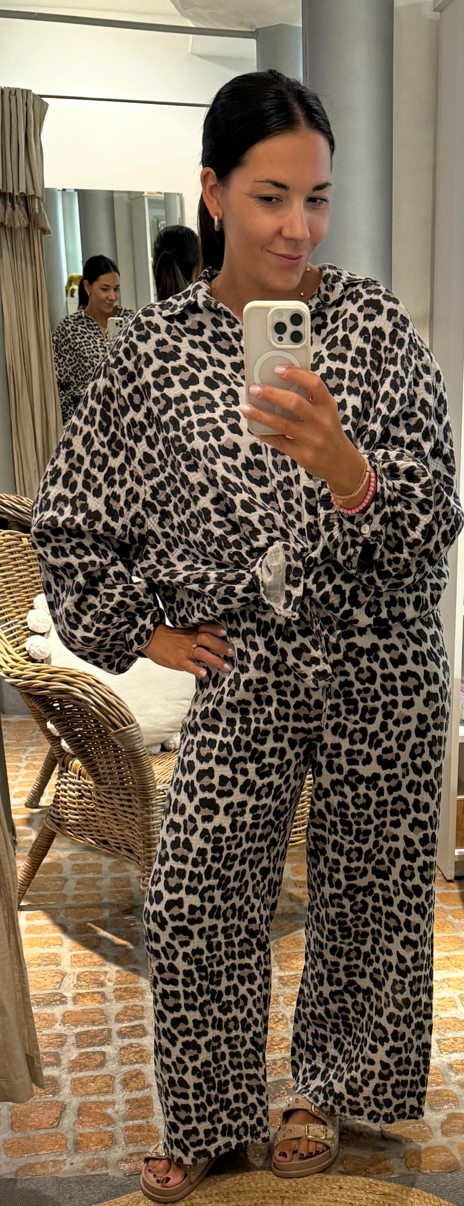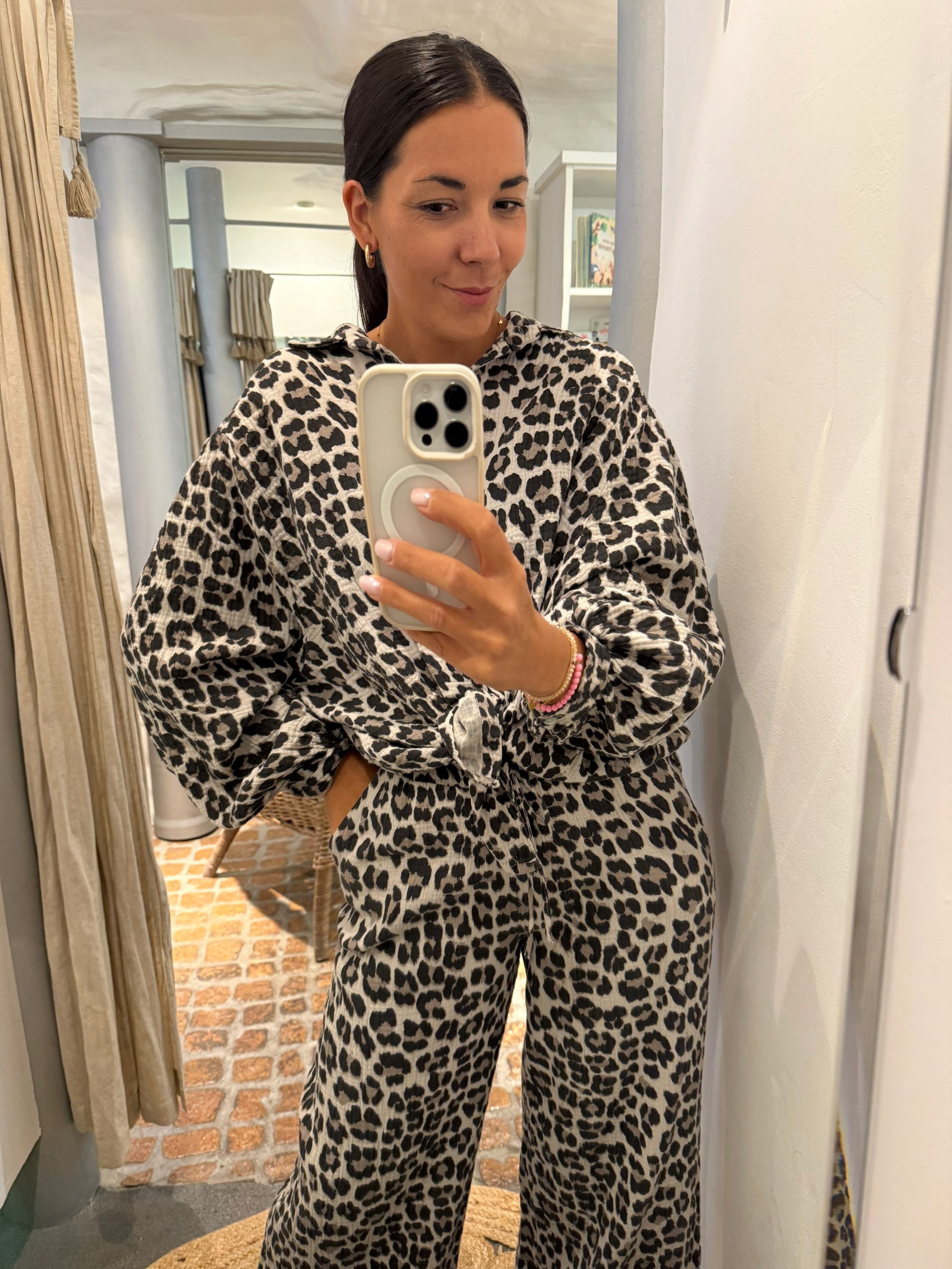 Gerade und locker geschnittene Leo Musselin Hose. Perfekt kombinierbar sowohl in einem lässigen Look mit passender Bluse oder auch mit einem Shirt oder Cardigan. Ob mit knalliger Farbe oder casual in gesetzteren Farben. Der Leo-Look ist immer im Trend!