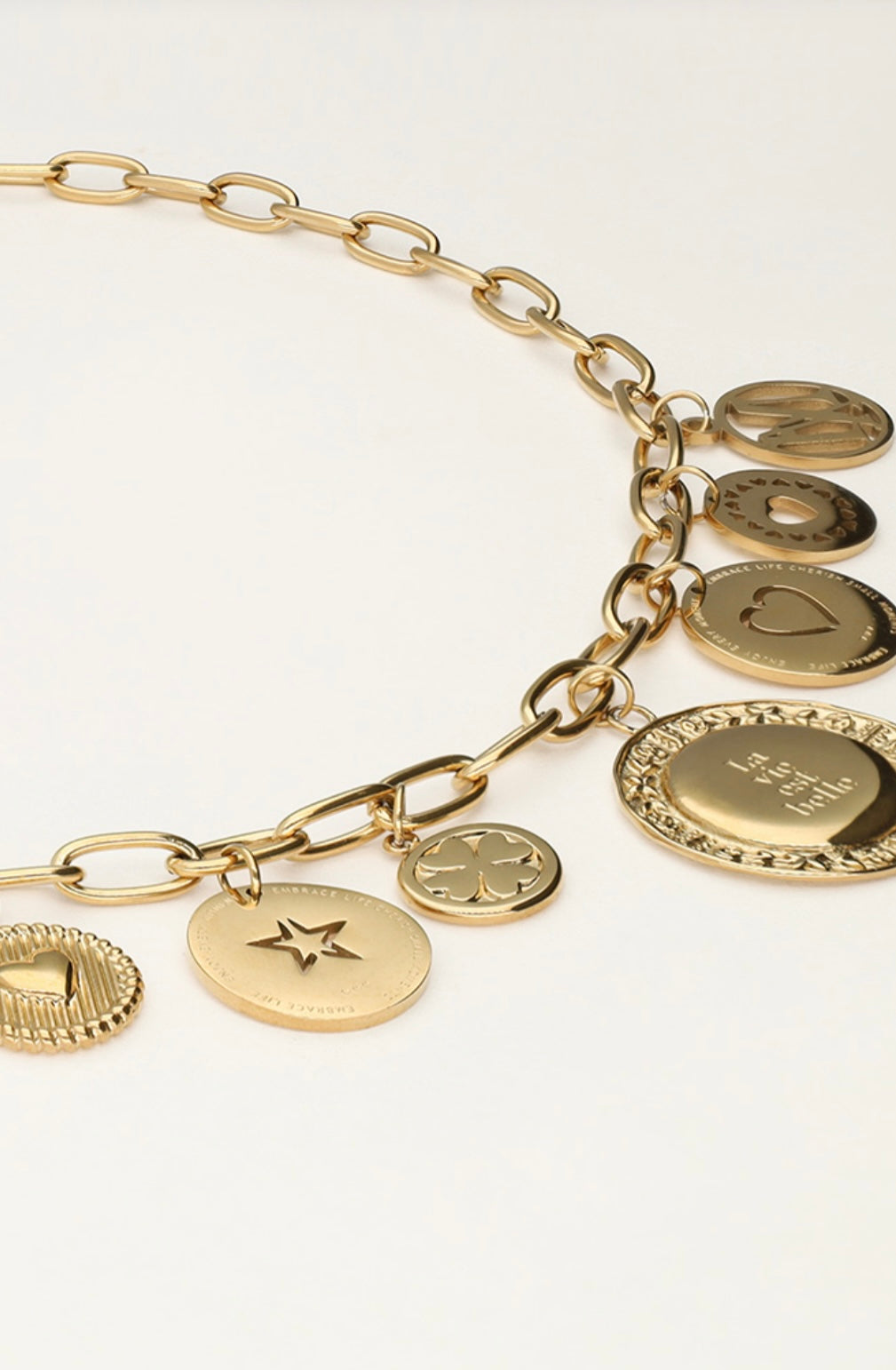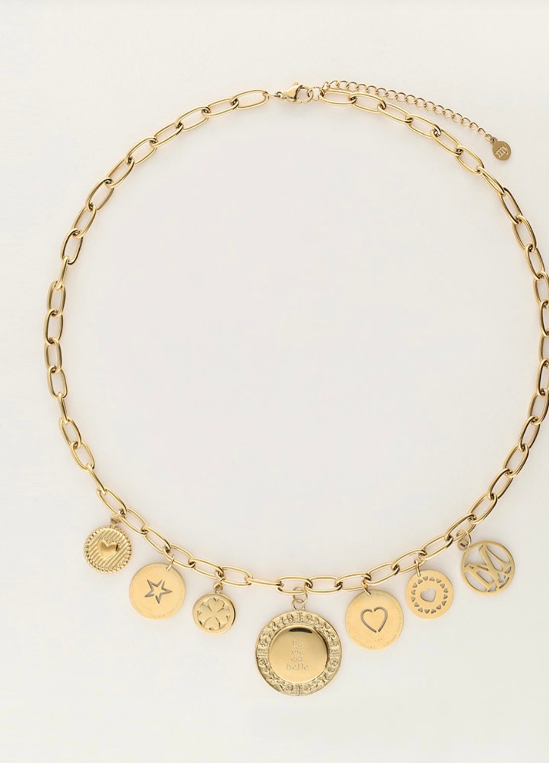 Feiere die Feiertage auf unserer unendlich magischen Party! Zieh dein schönstes Outfit an, trage funkelnden Premium Edelstahlschmuck und nd tanze die Nacht durch unter dem schimmernden Mond. Diese Kette ist ein echter Hingucker, mit dem du jedes Mal, wenn du sie trägst, im Mittelpunkt stehst. Die Kette mit Charms hat lustige Münzdetails mit Herzen und lässt sich dank ihres einzigartigen Designs perfekt mit deinen Lieblingslooks kombinieren. Kombiniere die Halskette mit dem passenden Armband für einen kompletten Look und stürme die Tanzfläche mit deinem schönen neuen Look Girl!