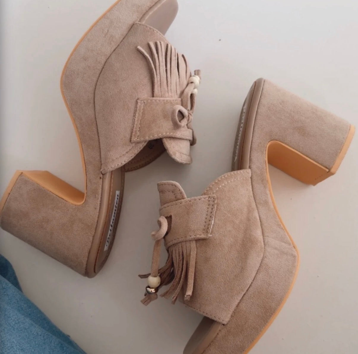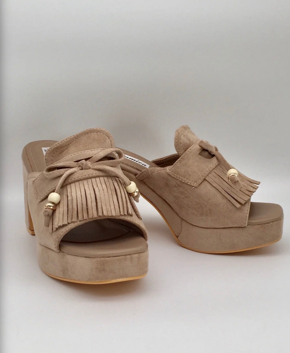 Plateau Schlappen mit Fransen-Detail. Super bequem wegen des Plateaus und gleichzeitig ein richtiger Statement Schuh. Eher nicht für schmale Füße geeignet.