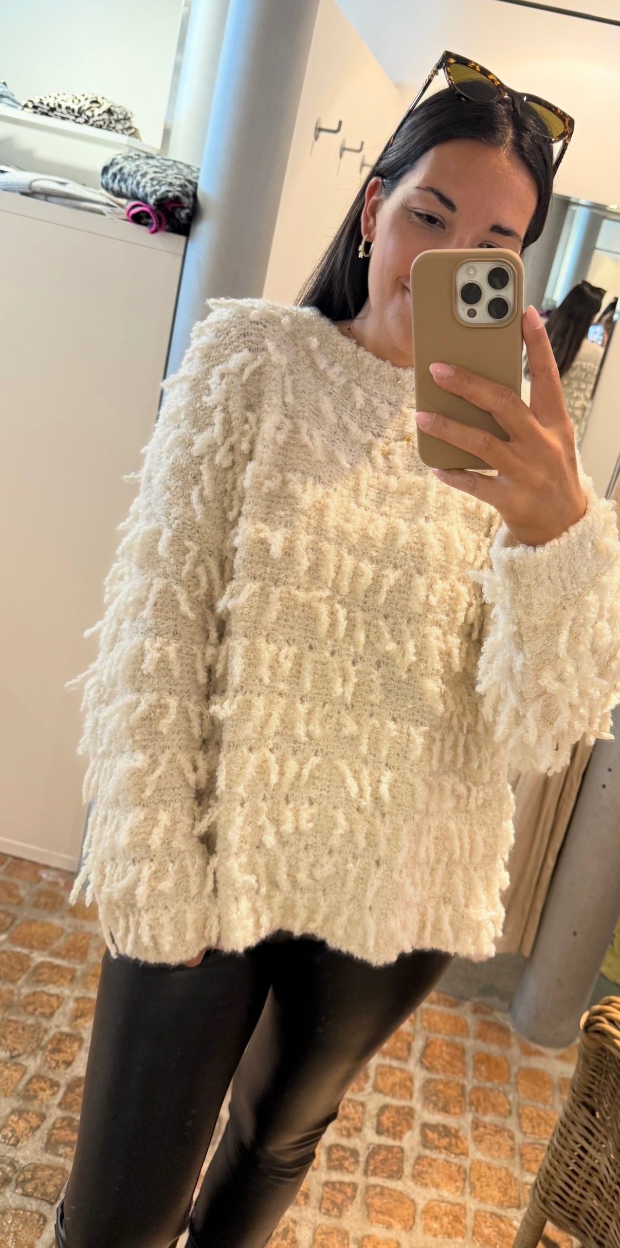 Pullover Roundneck mit Fransen-Detail, onesize. Der Pullover hat Fransen all over, was dem recht einfachen Pulli zu einem richtigen Hingucker macht. Ganz leicht mit einer Jeans, Leder Leggings oder einem Rock kombinierbar.