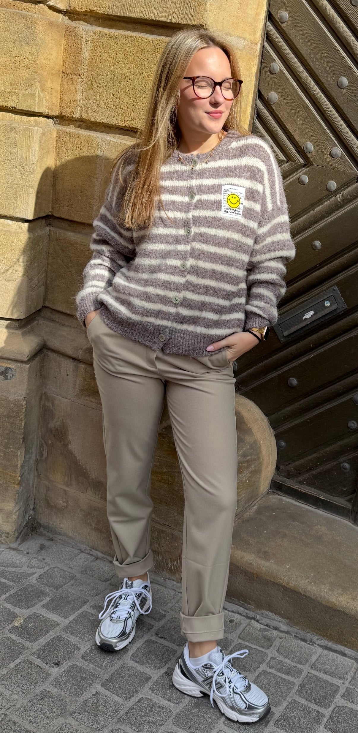 Diese bequeme Hose hat einen elastischen Bund auf der Rückseite und eine normale Passform. Sie verfügt über Seitentaschen, eine Paspeltasche mit Knopf auf der Rückseite und einen verdeckten Verschluss auf der Vorderseite, der für einen makellosen Look sorgt. Die umgeschlagenen Beinabschlüsse verleihen der Hose eine verspielte Note. Sie ist aus festen und gleichzeitig geschmeidigem Stoff gefertigt.